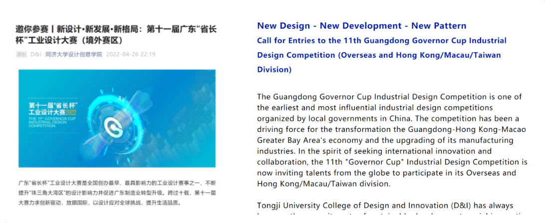 同济大学设计创意学院公众号发布“省长杯”境外赛区作品征集通知
