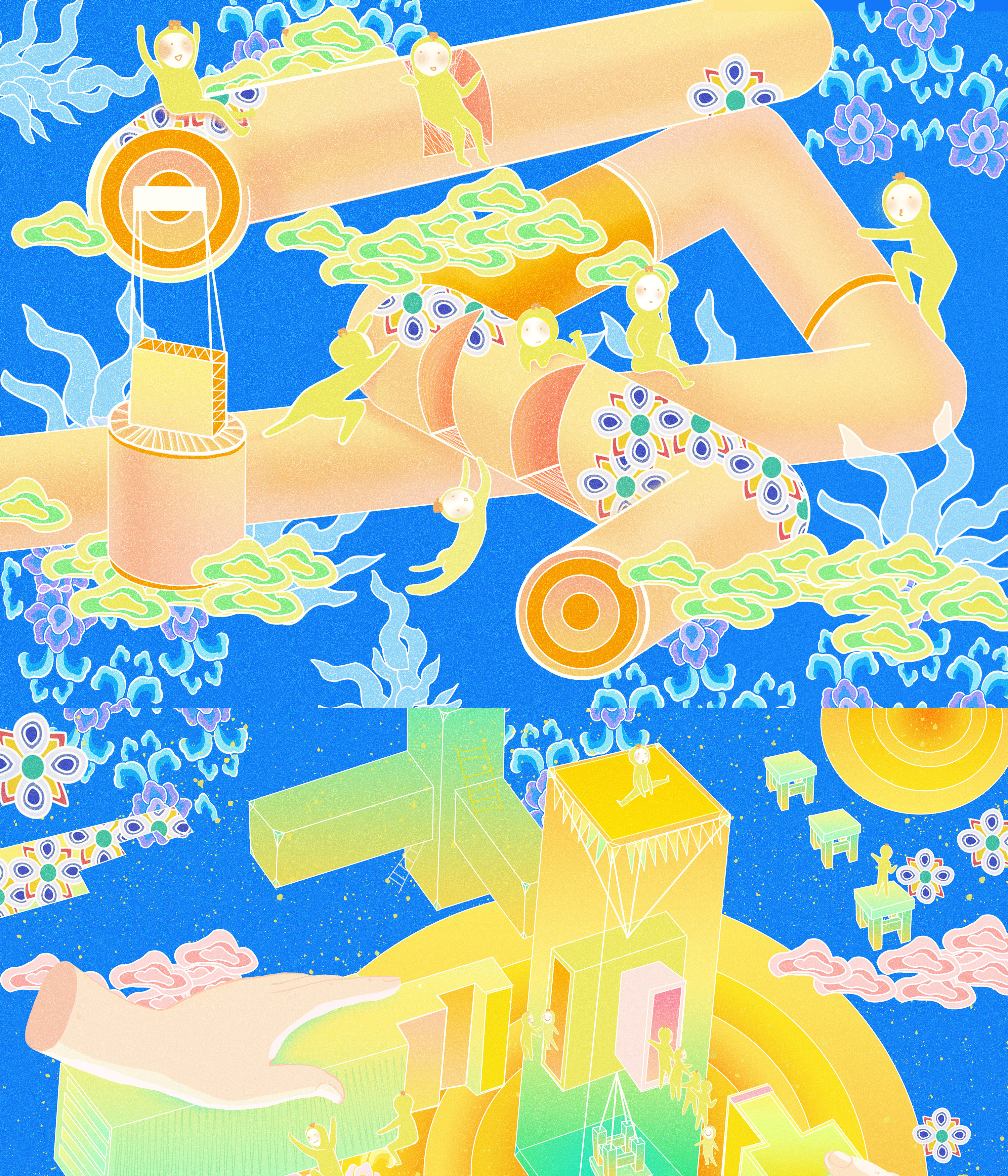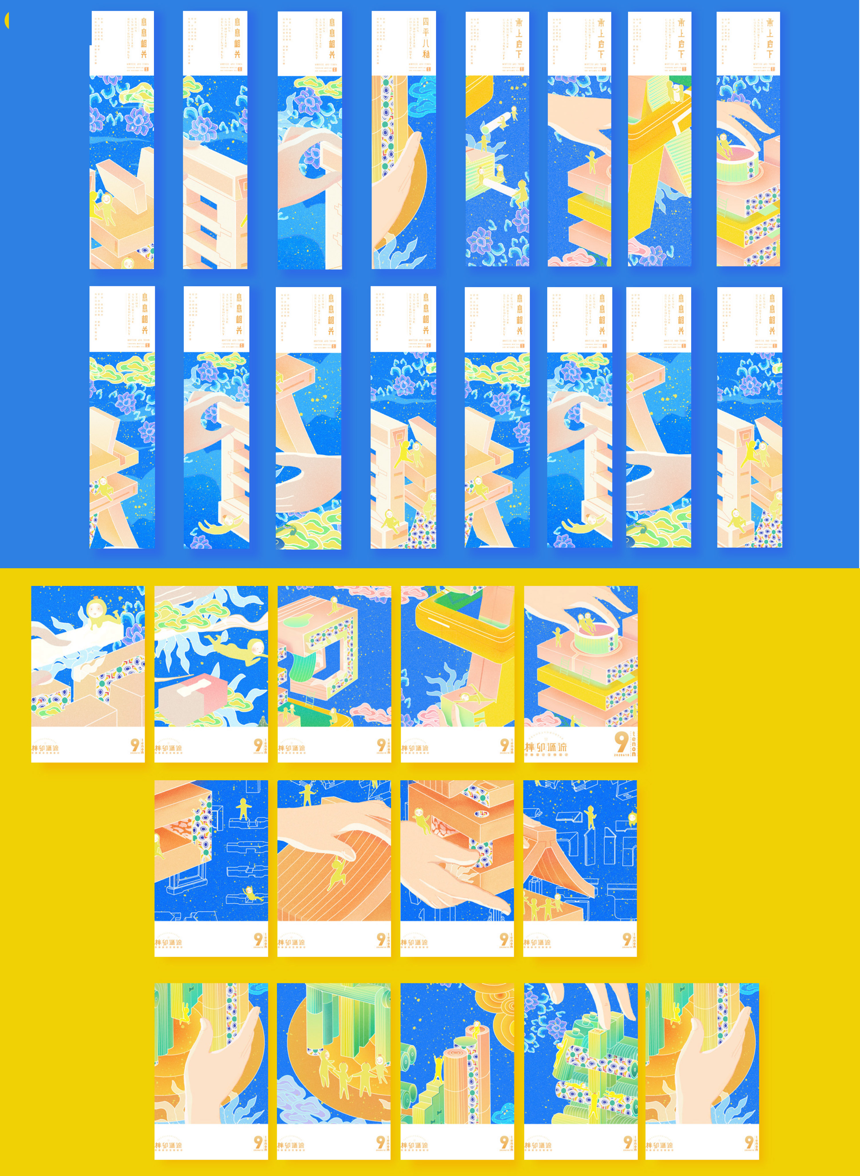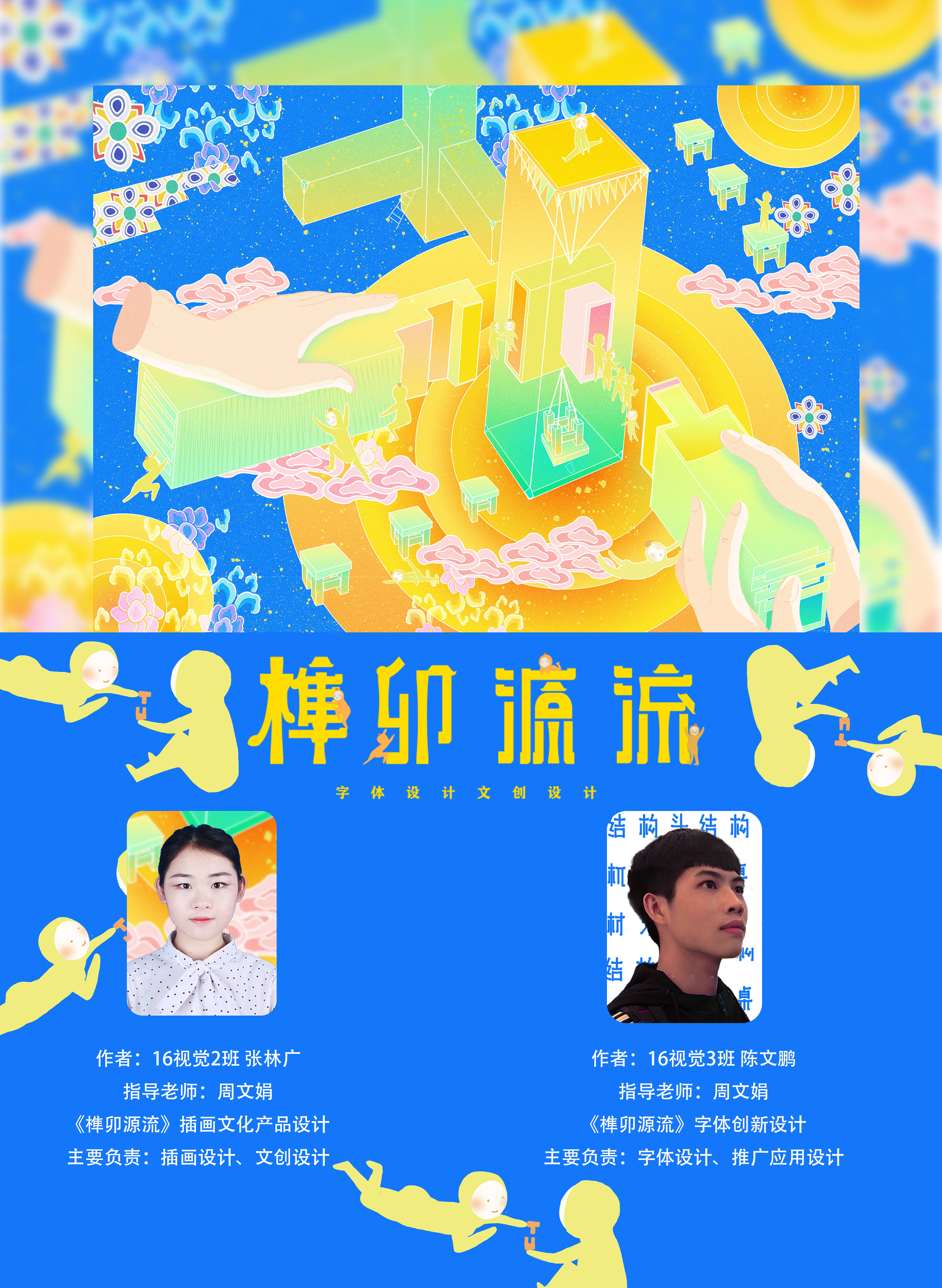 该课题以榫卯工艺为主题,提取榫卯的精神品质“韧-联-稳-融”为设计核心,意义在于激发榫卯生命力、吸引年轻人对与榫卯文化的注意力。现如今由于榫卯的应用范围越来越小,这项工艺文化逐渐走出时代的舞台,多使用于家居或建筑设计中,较为保守,于是我们从榫卯的结构入手,利用字体设计与插画设计结合的方式来展开设计。在视觉效果上以蓝色搭配黄色为主要色,整体明亮清新,插画设计中主体以榫卯结构为主体,利用榫卯拟人卡通形象进行场景互动。字体设计中,简化榫卯结构,得出基本形态再进行组合设计。榫卯文化意寓着团结协作与保持个性,我们希望通过这样的方式达到宣传榫卯文化与引导年轻人正确价值观的目的。