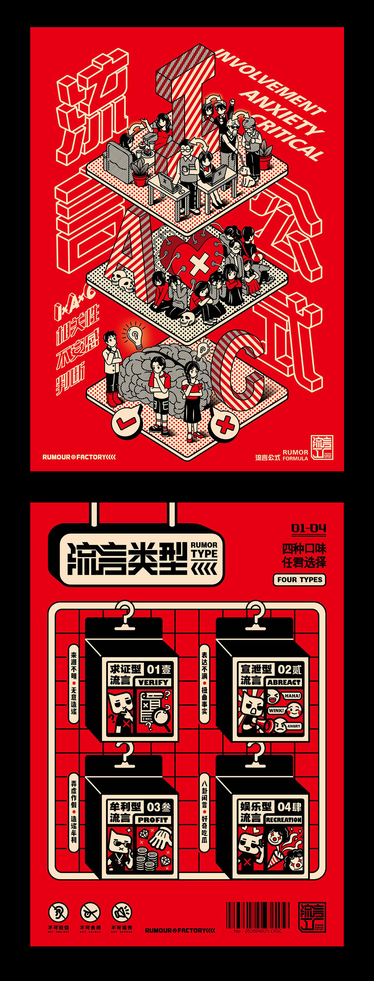 《流言工厂》是以流言为题材进行创作的主题系列设计,新媒体时代的到来,流言的传播渠道也变得越来越广,信息也越发缭乱,它给舆论环境造成很大的负面影响。对于这种现状,我想通过设立“流言工厂”这一主题来反映当今社会上的流言现象,并引发观众对于流言负面存在的思考。在本次毕业设计创作中,包含有插画、海报、动画视频等内容,插画主要描绘了九类流言制造者的形象,而海报则通过以图为主的方式来向大众传达有关于流言的相关资料,动画视频以简短的剧情来展现流言工厂的存在,通过以上几类设计内容来构造《流言工厂》的整体。