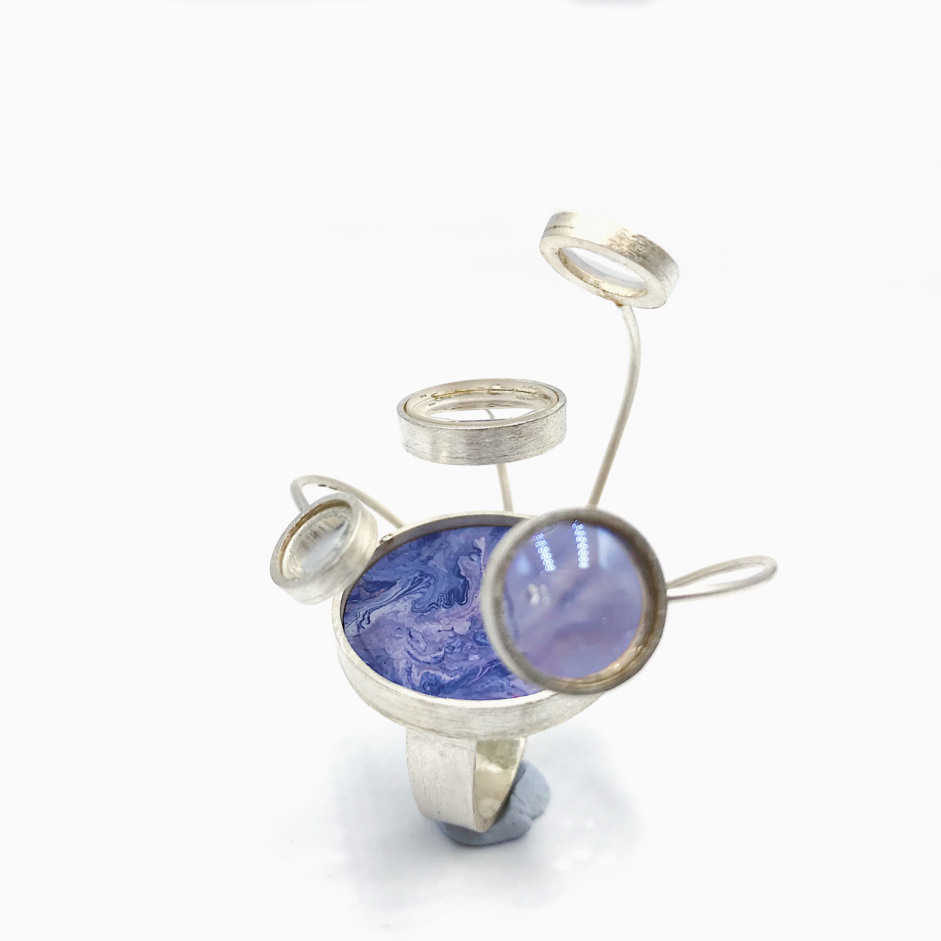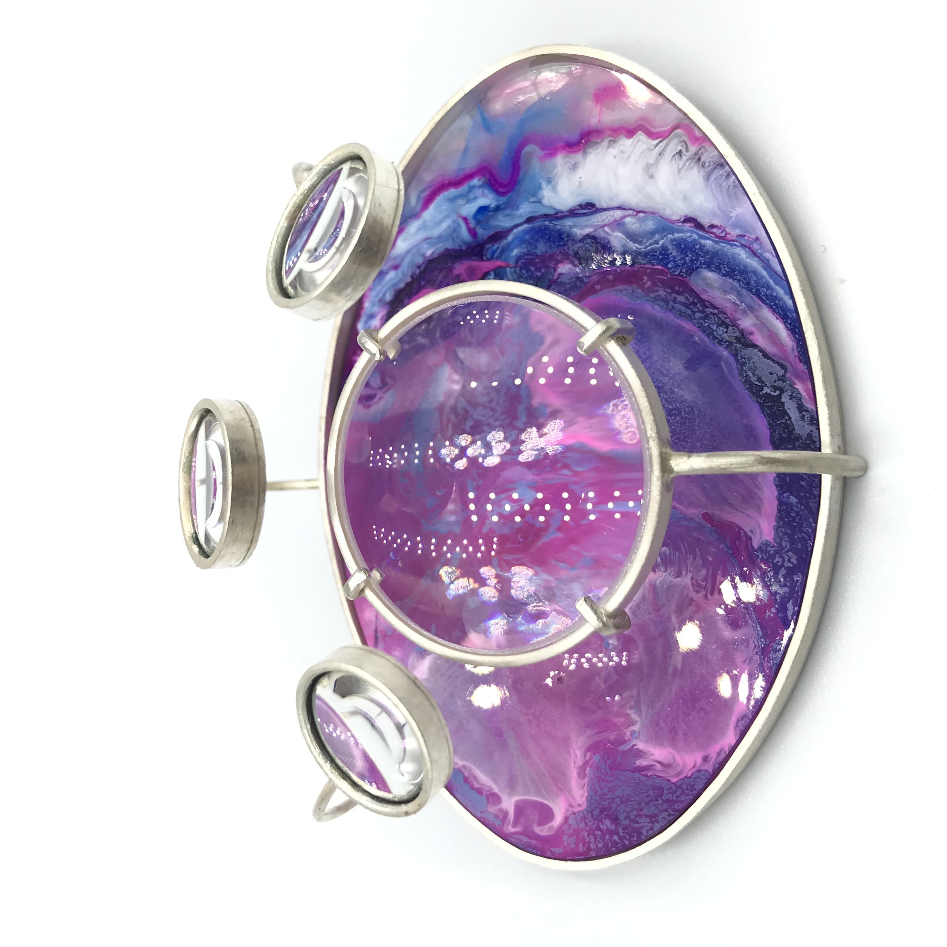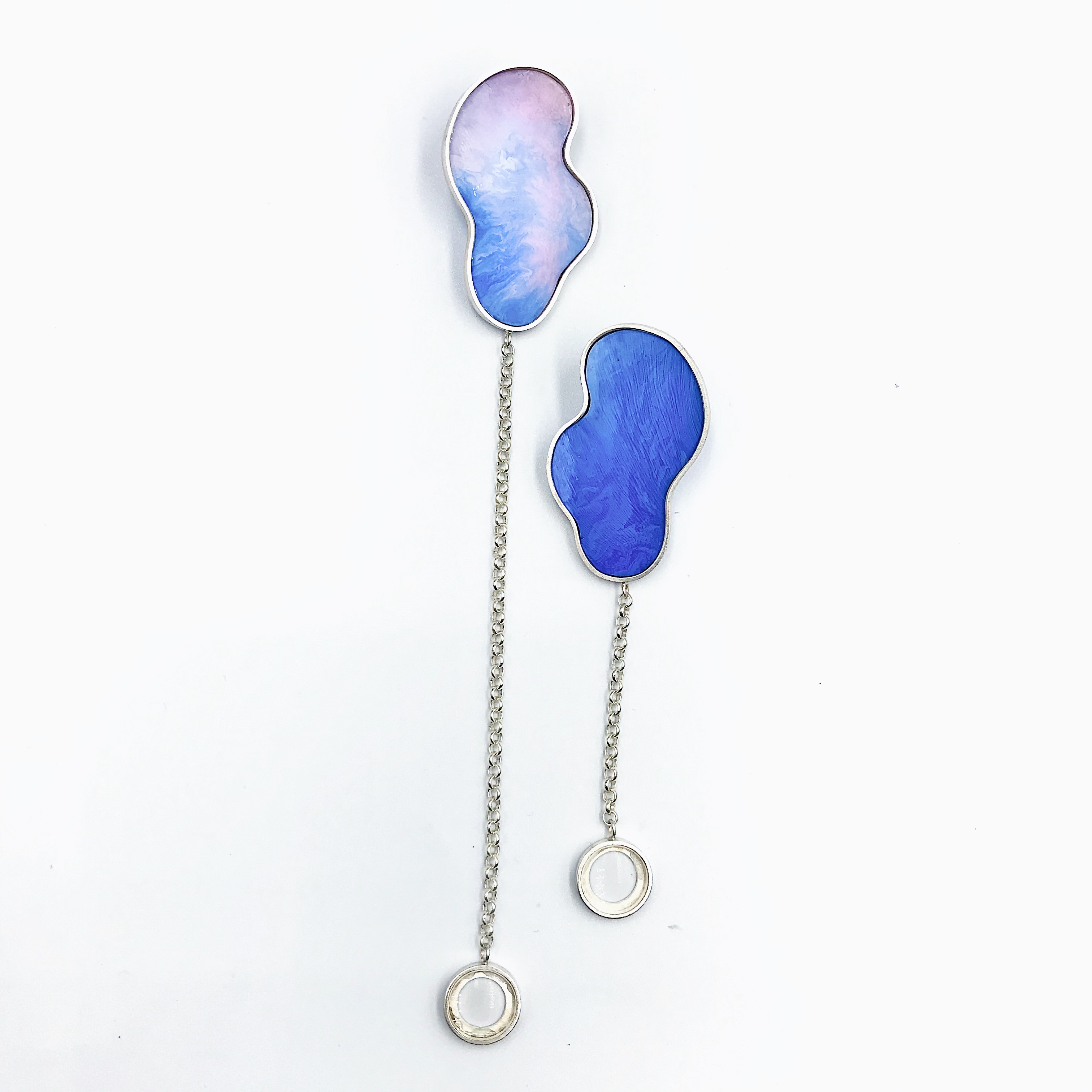 在这次设计中我着重首饰的色彩创作,表达出梦境中的色彩,梦中沙滩,山川肌理的表达,天马行空的、科幻云彩的表达。材料上运用到放大镜来观察色彩的变化去感受内心的波澜,运用到纯银对树脂进行了再加工,对其进行链接。通过滴剂的色彩晕染,来描绘潜意识的脑内奇景,讲述某个风景独特地方的天空、山峰或河流等梦境中的碎片给我传递的情感。在记忆的碎片里拼凑着各种梦幻般色彩的天空和夜晚里的星河。将梦中的场景重组定格在首饰中。徘徊于具象与抽象之间,是意识与潜意识的碰撞,饱满的情感表达清晰可见。
