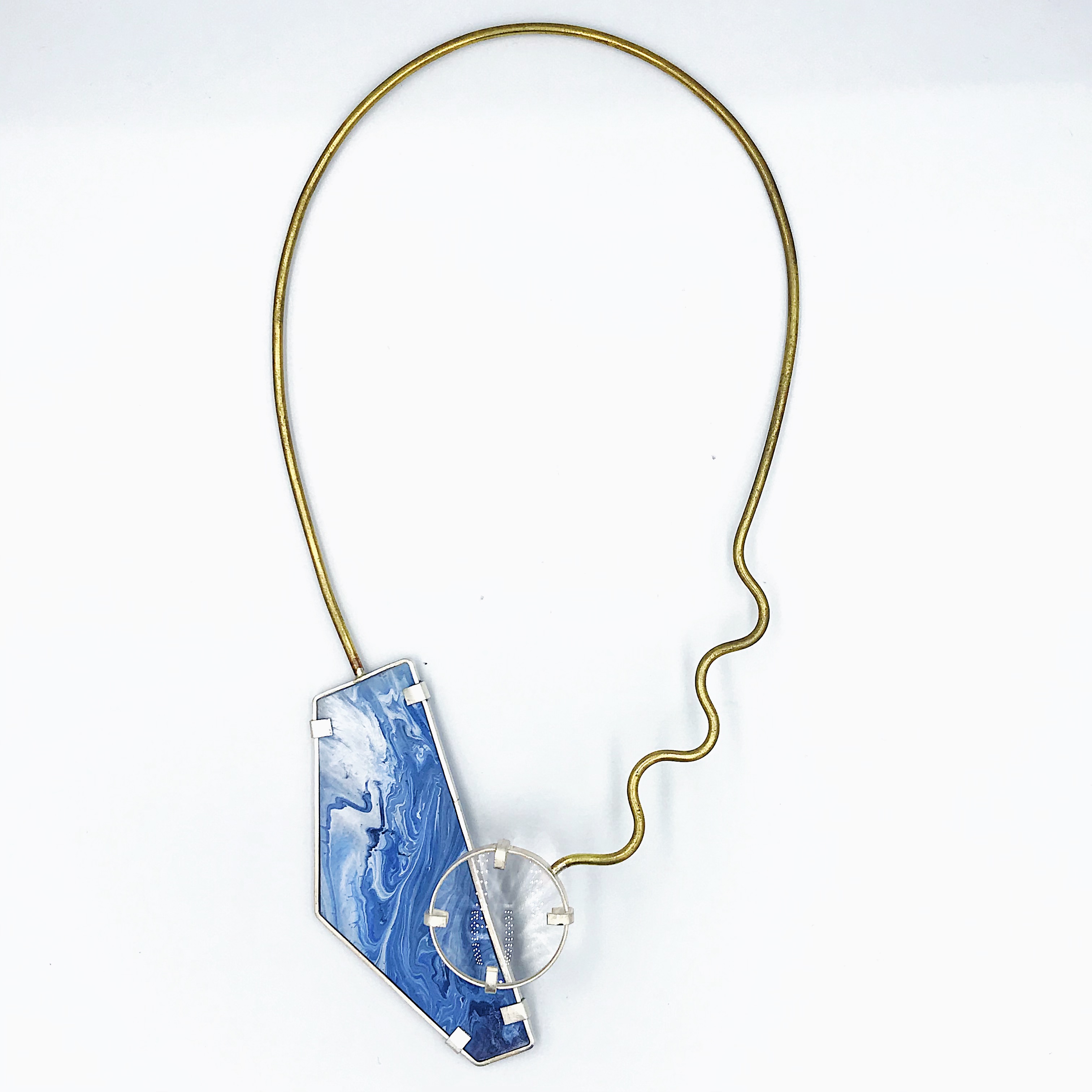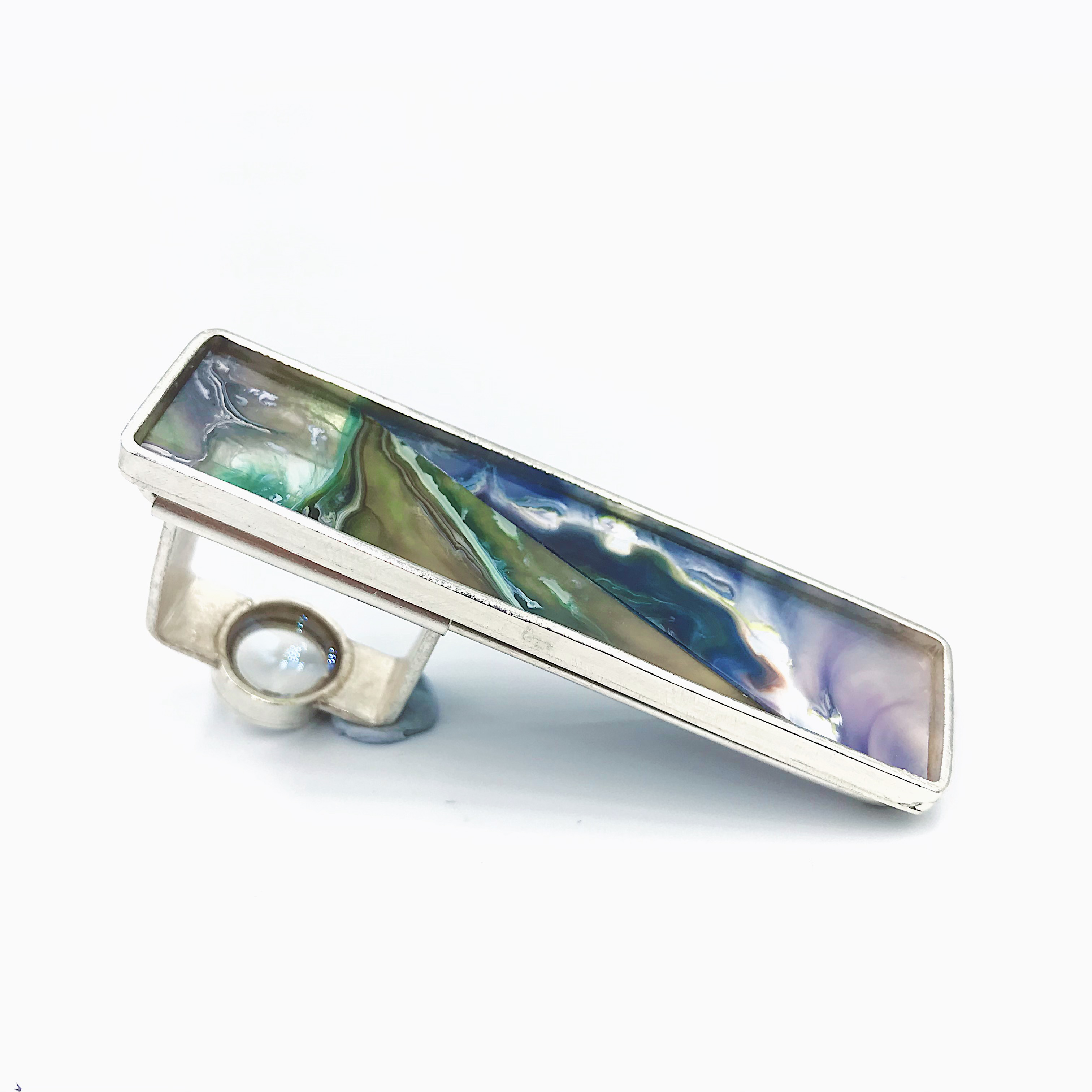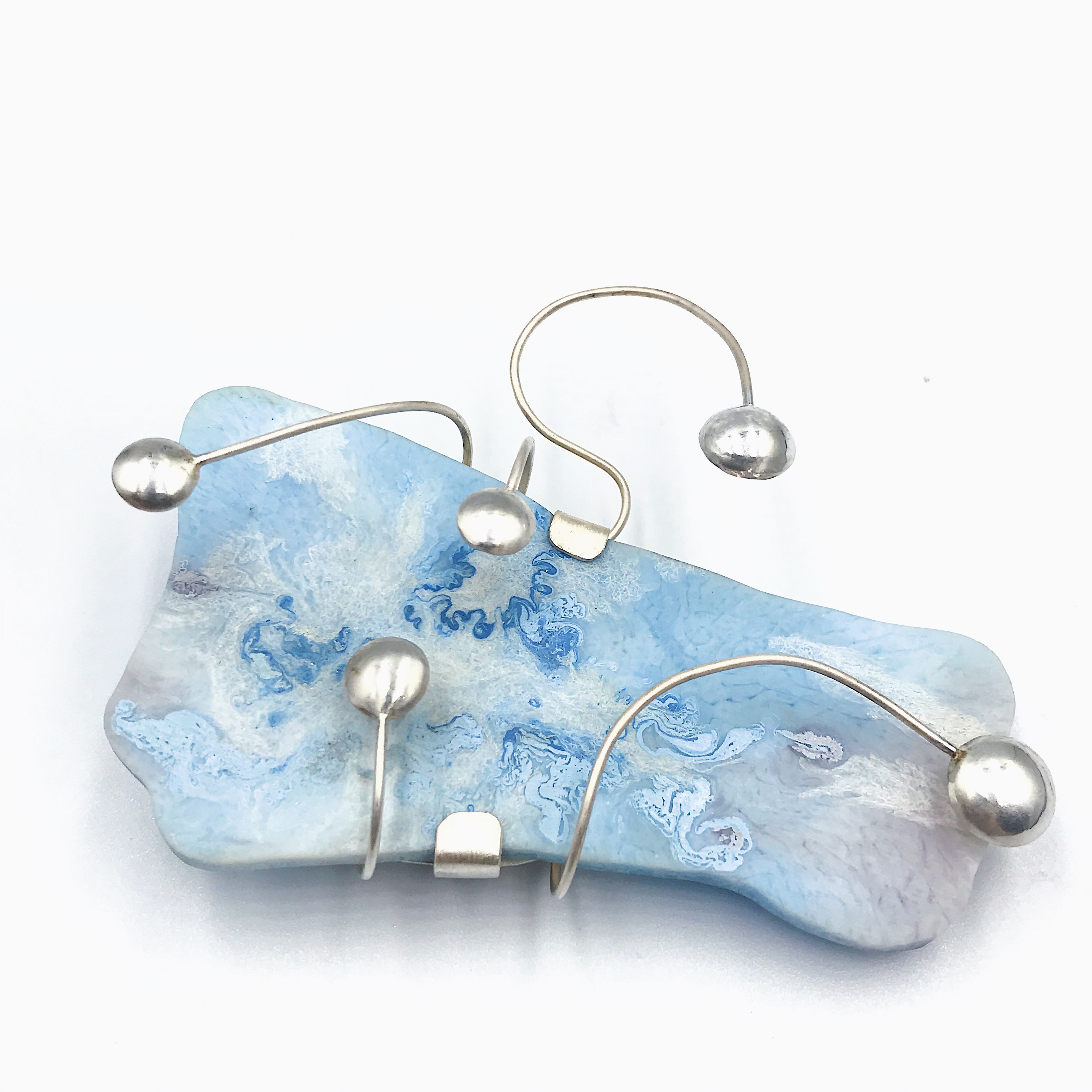 在这次设计中我着重首饰的色彩创作,表达出梦境中的色彩,梦中沙滩,山川肌理的表达,天马行空的、科幻云彩的表达。材料上运用到放大镜来观察色彩的变化去感受内心的波澜,运用到纯银对树脂进行了再加工,对其进行链接。通过滴剂的色彩晕染,来描绘潜意识的脑内奇景,讲述某个风景独特地方的天空、山峰或河流等梦境中的碎片给我传递的情感。在记忆的碎片里拼凑着各种梦幻般色彩的天空和夜晚里的星河。将梦中的场景重组定格在首饰中。徘徊于具象与抽象之间,是意识与潜意识的碰撞,饱满的情感表达清晰可见。