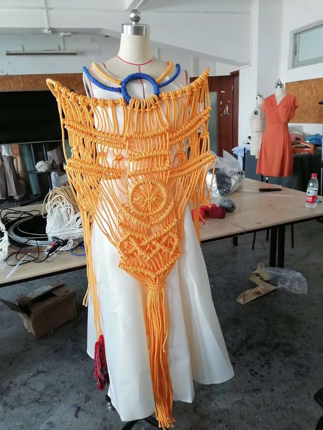 “四象”服装设计系列作品一共4套,在服装设计中主要表现在云肩上面,大色调方面统一采用灰色系,局部色调结合四象相应的五行特征,已经对四象的元素了解进行微调,使系列作品更加贴合四象的玄幻、飘渺和神秘。材料方面,6mm涤纶丙纶编织绳和铁丝两种结合使用,通过铁丝充当造型支撑骨架,6mm编织绳编织覆盖,形成立体的纤维浮雕,再搭配上疏密不一的纹路和图案,层次感丰富。辅料方面,使用棉线和棉绳,搭配不同颜色或者以喷泵和喷笔的喷绘的形式,使接近相应动物的毛发已经产生渐变效果。