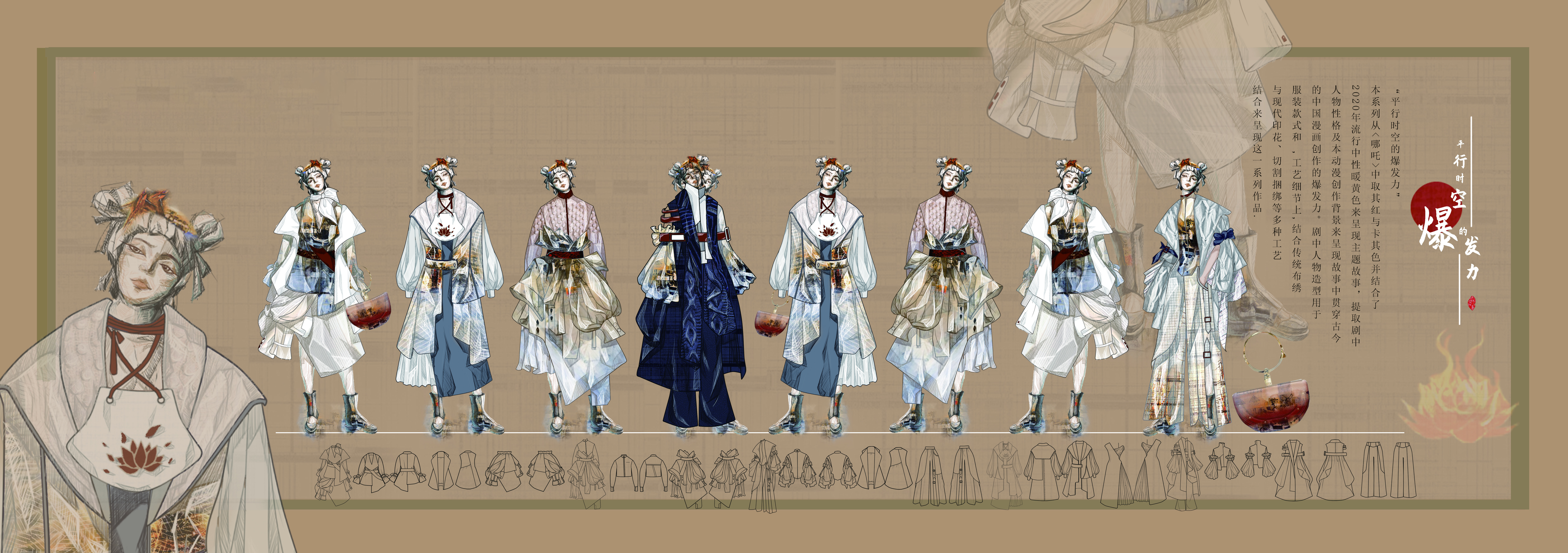 这一系列灵感源于《哪吒》这部国漫,剧中哪吒身不由己却坚决反抗,只为选择自己命运,即使不被理解、排斥,但最后关头他依然选择了勇敢和善良,它的精神让我动容。电影中还融入了方言等民族文化符号、当代人们的生活态度,让传统文化故事走进人们的生活,并深受喜爱,以此作品也希望有更多的人发现优秀传统文化有趣的一面。