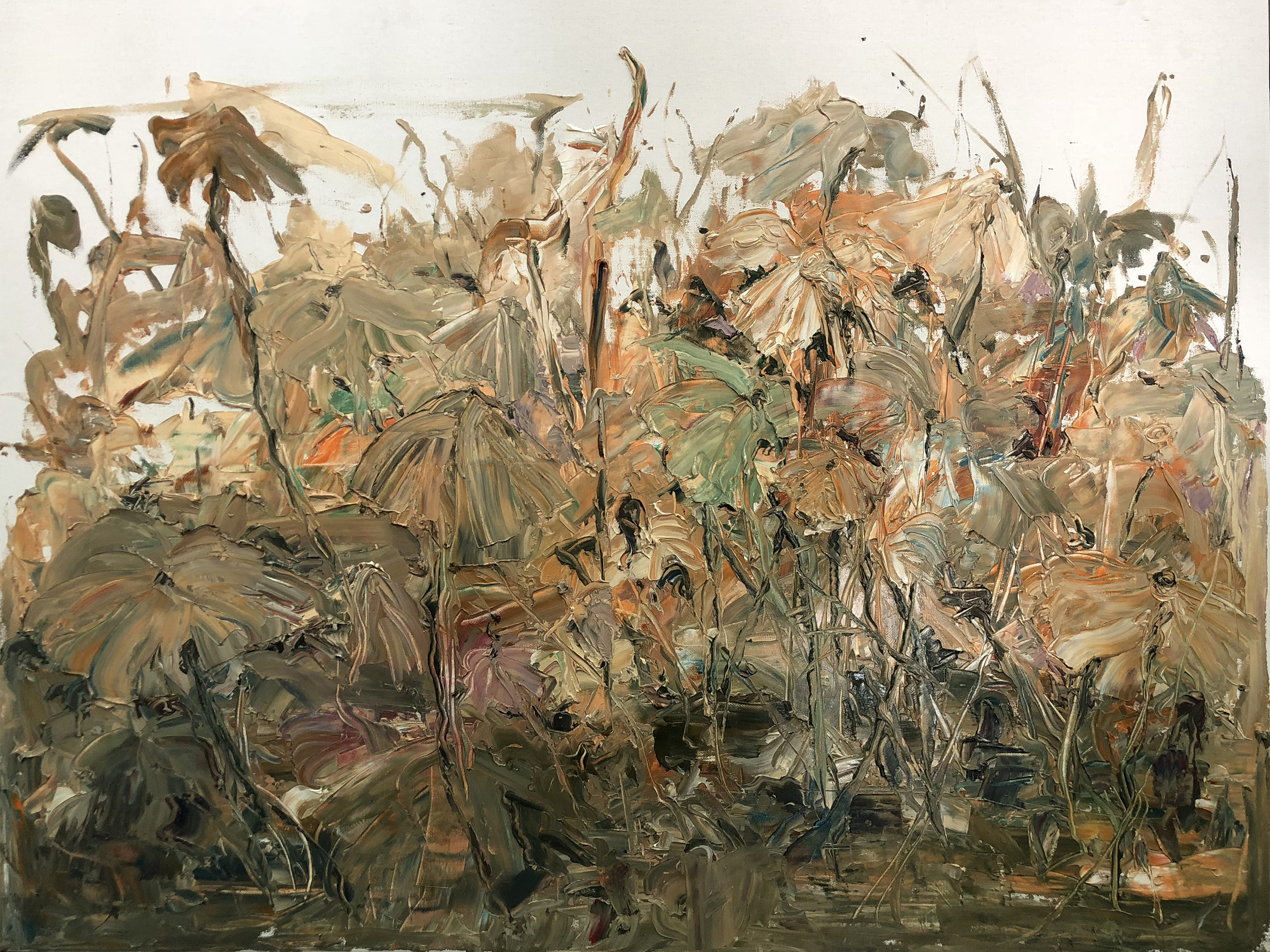 在创作中,我主要用刮刀的技法,做大的笔触机理和注重颜色的控制和情感的表达,来体现一种的印象感,这种印象感似乎有着一种不确定性,这种不确定性的最早我还是从艺术家方力均那里得知的,更重要的是,画出了自己的不被太多规则所牵制的自由感!
