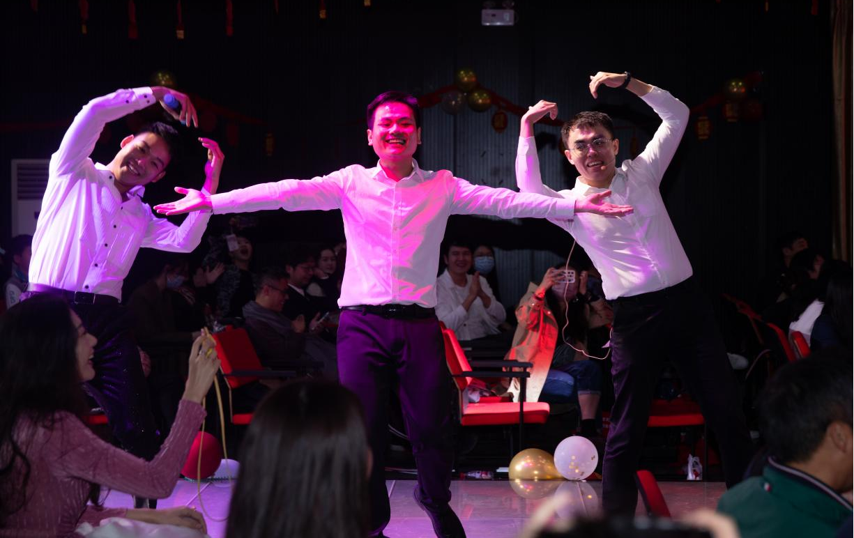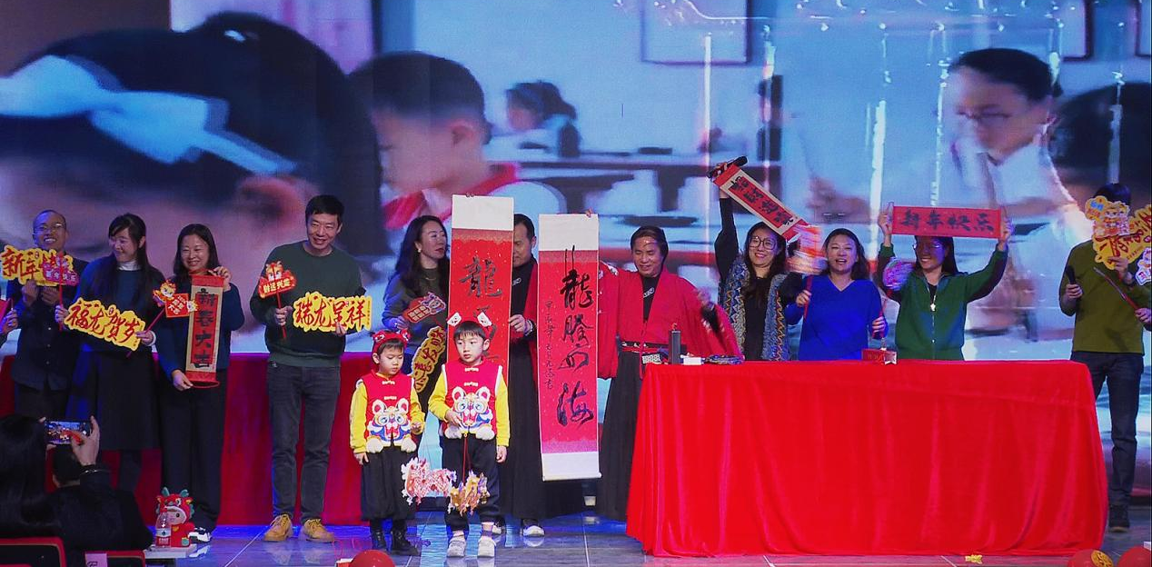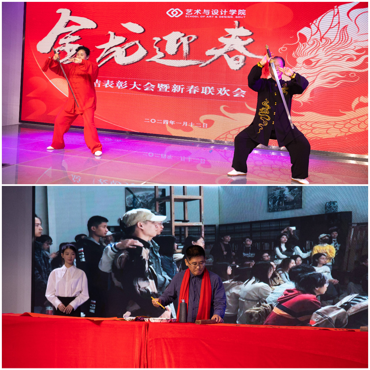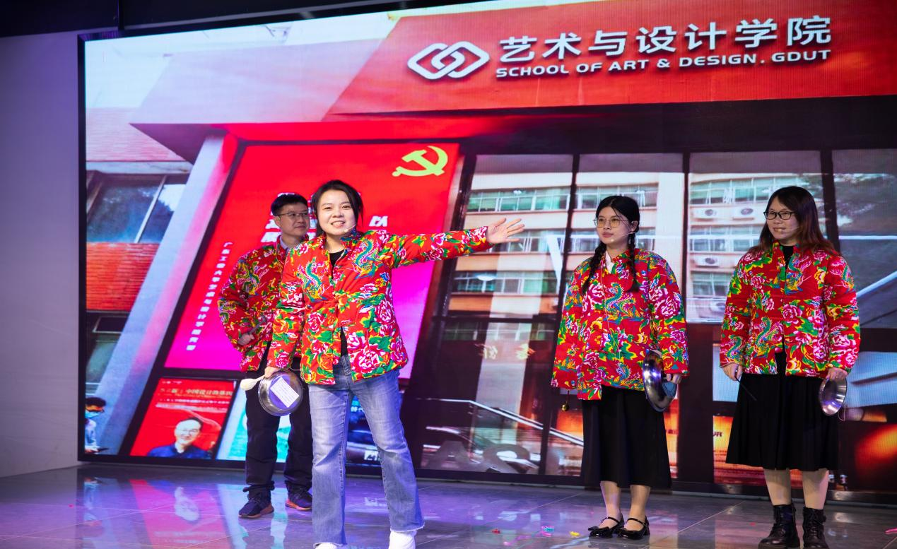 学工全体辅导员在华国栋副书记的带领下,带来由郭娜老师精心编排的情景朗诵《星火燎原》,通过重读《共产党宣言》彰显教师党员的育人初心与使命;实验中心带来朗诵《我爱工作2.0》,其幽默又温情的语言展示了“以生为本,安全第一”的工作坚守;党政办公室、教务办公室献上《龙年迎春三句半》,将学院业务发展与育人成效相结合,展现出“奋楫扬帆”之风采;工业设计系教师代表深情献唱《笨小孩》和《New Boy》,让流行音乐在舞台绽放光彩;数字媒体与动画系教师联唱《歌曲串烧》,尽显多姿多彩的精神面貌;时尚设计与展演系教师发挥专业特色,打造一场形音兼具的T台《乡音大秀》;美术系教师带来《双人24式太极剑》和《挥春迎新年》,弘扬中华优秀传统文化;环境设计系教师《双龙出海》书法表演,为全体教职工送上龙年祝福;视觉传达设计系教师以一首《最炫民族风》调动起现场观众热情。最后,学工团队凭借青春洋溢的舞蹈《爱你》将联欢会氛围推向高潮。