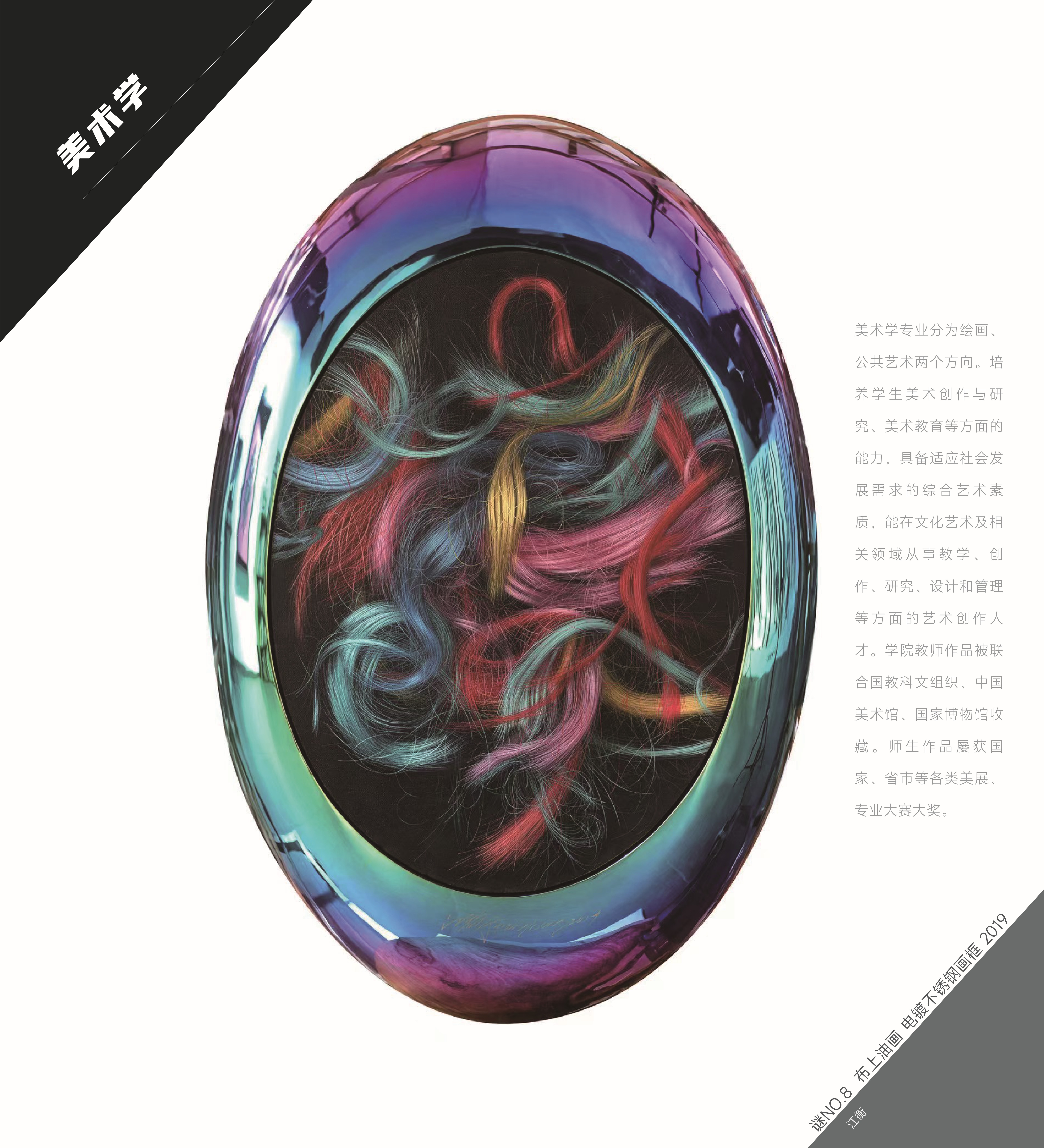 美术学专业为四年制本科,所授学位为艺术学学士。大一学年完成美术学基础课程学习。大一第2学期按照学生意愿选择主修方向进行分流,分传统绘画、公共艺术两个方向进入专业学习。大二、大三学年完成专业课学习,核心课程有:中外美术史、水彩画理论与技法、油画理论与技法、中国画花鸟、中国画山水、书法与篆刻、泥塑、浮雕、纤维艺术、当代艺术创作与研究、景观公共艺术、毕业创作等。在大四毕业环节打通系内系外专业界限,允许与其它专业团队合作,形成鲜明的的跨专业学科特色。我校美术学专业依托我校的工科背景及“新文科”下69书吧 现有的设计专业的优良资源,已经创办出既有自身特色又有区域优势的美术学专业。
