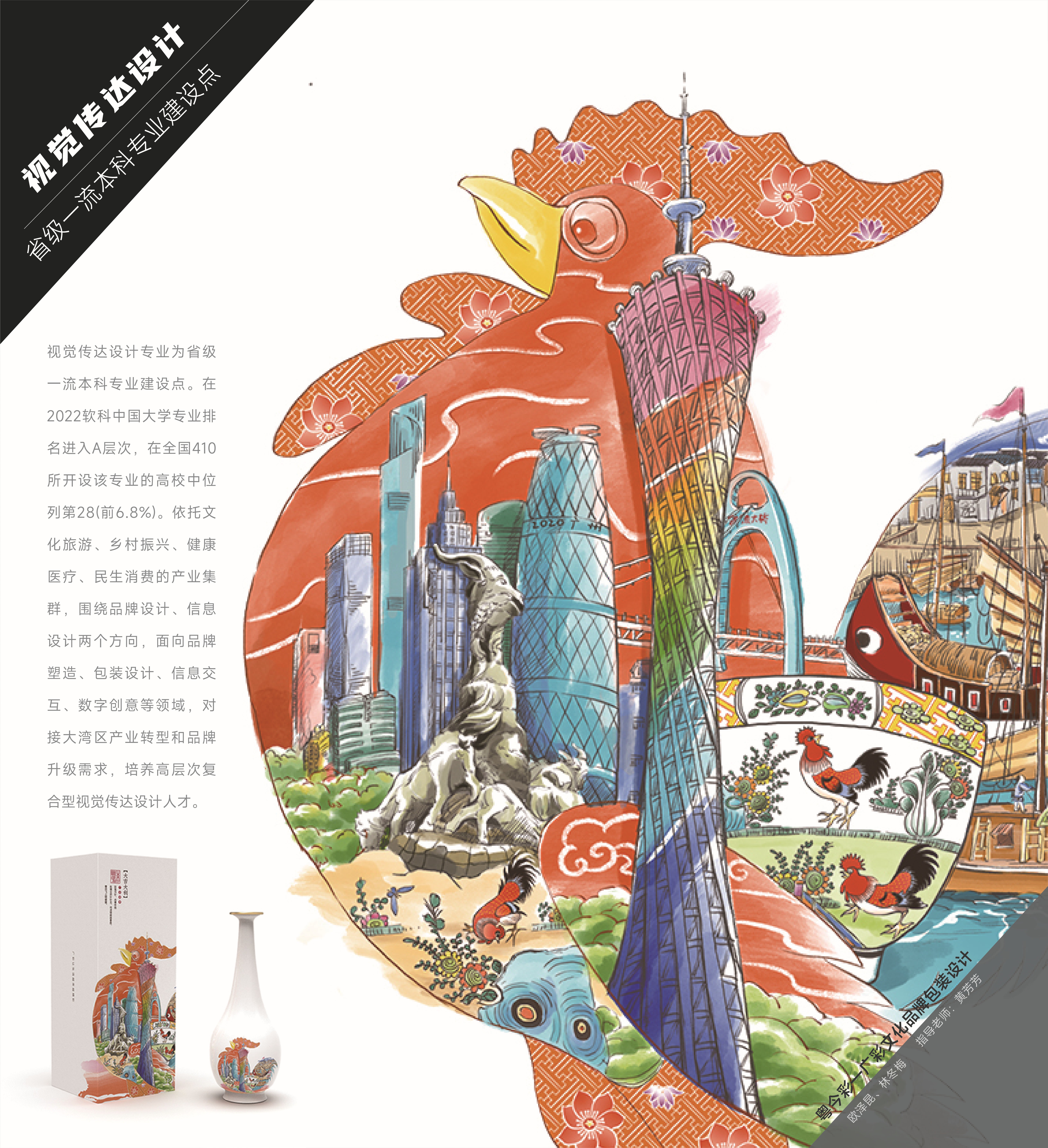 视觉传达专业凭借学校工科优势,始终把握设计在国家战略、粤港澳大湾区发展中的引领性与创新性,依托文化旅游、乡村振兴、健康医疗、民生消费的产业集群,对接大湾区产业转型和品牌升级需求,不断推进人文、科技与媒介传播的互融,设立品牌设计Brand Design、信息设计Information Design两个培养方向,培养国家重大需求与民众生活结合、国际视野与企业实际结合、传统造物与现代创新结合的高层次复合型设计人才。